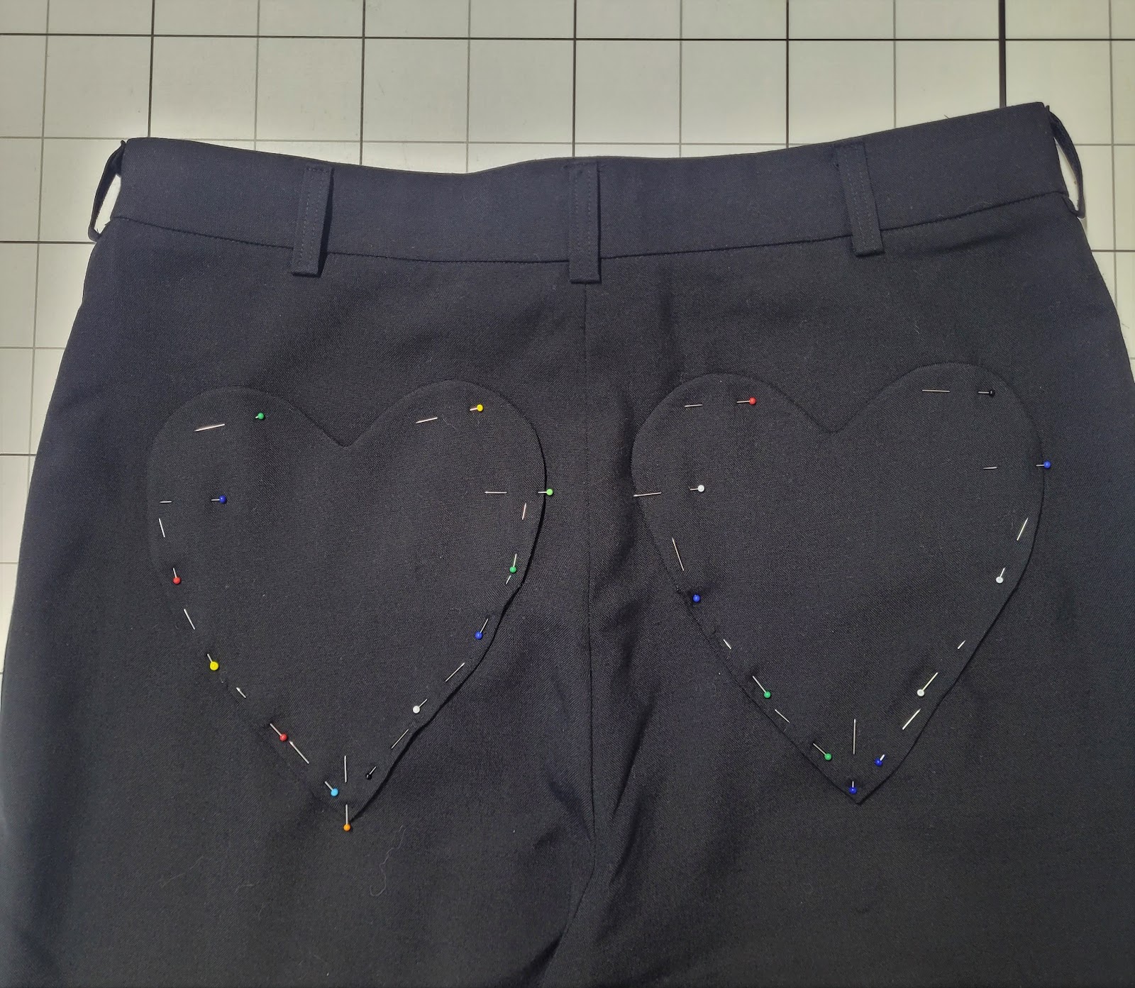 Toisinkuin paitani kanssa, housujen mallin valinta oli haastavaa, koska olisin ihan hirveästi halunnut toteuttaa kaikki ideani. Lopulta päädyin klassisiin mustiin suoriin housuihin, sillä ajattelin, että niiden kanssa saisi luotua monta erilaista asua. En kuitenkaan halunnut niiden olevan aivan tavalliset, joten siksi päätin lisätä sydämenmuotoiset takataskut!